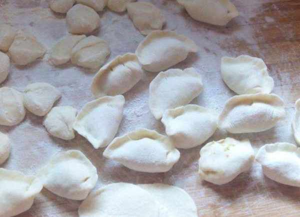 第七步:将长条切成较小的饺子,擀成中间厚边薄的饺子纸,在皮中间放上适量的馅料,揉紧擀成饺子。