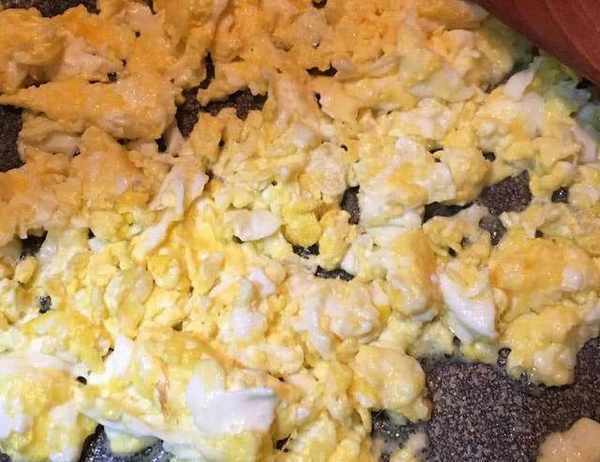 第三步:锅里放油烧热,油烧好后倒入蛋液,待蛋液凝固熟成泥备用。将鸡蛋切碎,直到它们变凉。