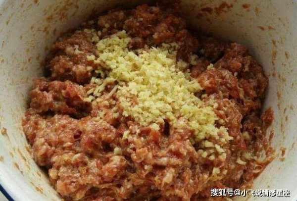 第三步:猪肉切肉馅,葱切姜切末。将肉末、姜末、葱花放入大碗中,加入适量的辣椒粉和生抽,拌匀后略腌。