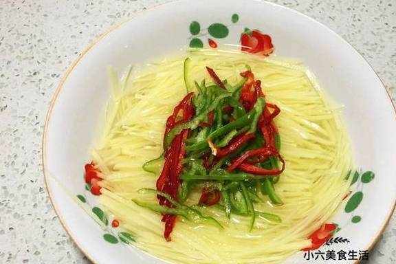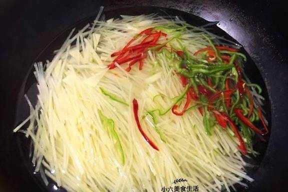 6锅内加入水烧开,然后把土豆丝青红辣椒丝倒进去,烫一下立刻捞出!