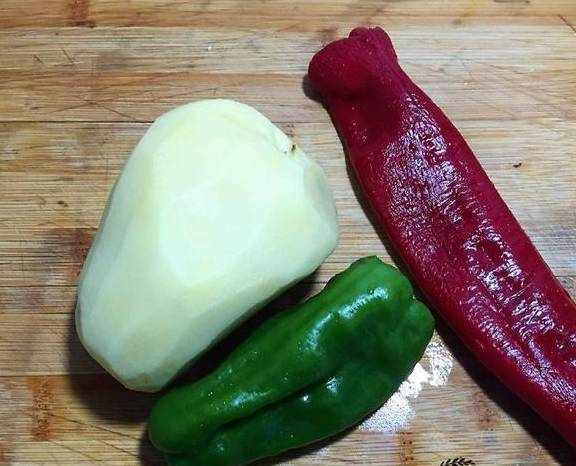 1把土豆洗干净后去皮,青辣椒红辣椒各一个,去根后洗干净!