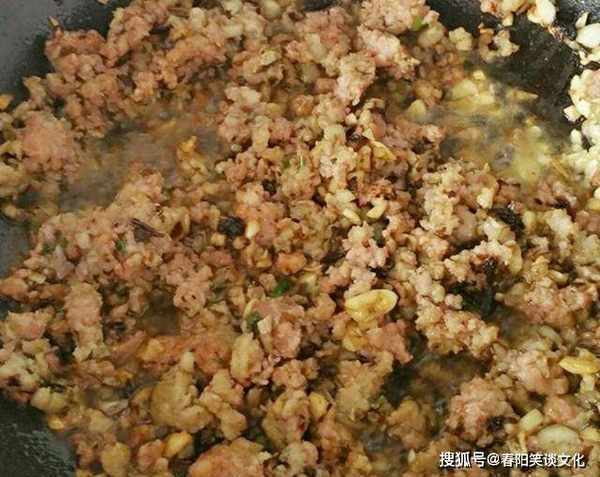 第五步:在平底锅中加热油。油烧开后,加入葱花和姜末炒香,下入猪肉。