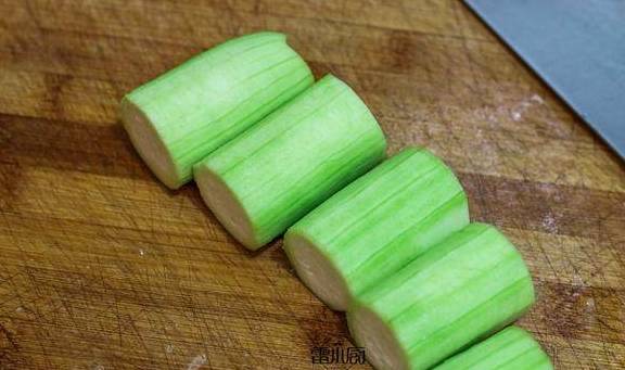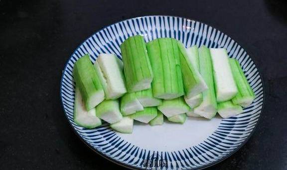1、丝瓜去皮,清洗干净,切成长度样的长段。