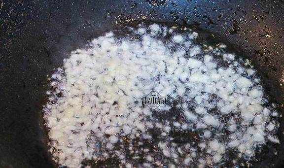 4、热锅凉油,开小火,倒入大蒜翻炒出香味。