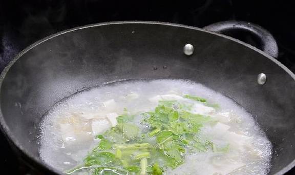 豆腐烧开后加入油菜继续煮开(因为放了油,所以青菜能保持翠绿感,更有食欲)