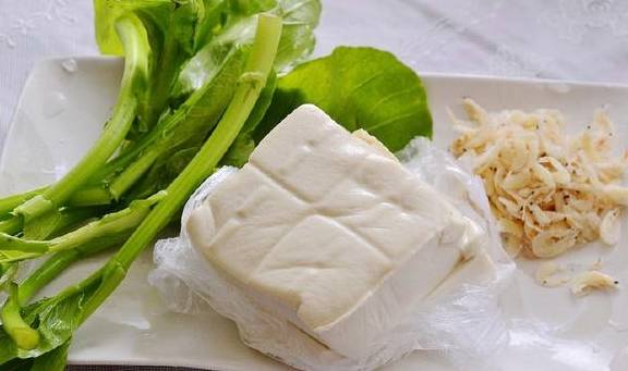 准备的材料有嫩豆腐2块油菜适量虾皮适量调料:盐鸡精