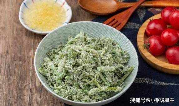 这样既可以保持菊花的绿色,又可以防止菊花出水,然后撒上适量的盐搅拌均匀,最后撒上适量的面粉。