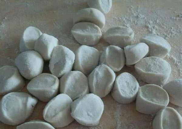 第六步:将饺子切成小块,擀成中间厚边薄的饼,取出适量的馅放在中间,揉匀后擀成饼。