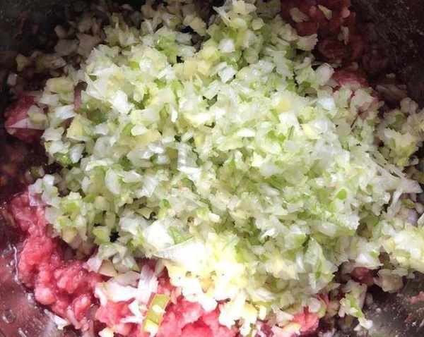 第四步:将萝卜泥放入肉馅中,倒入适量的食用油、香油和盐,搅拌均匀即成饺子馅。
