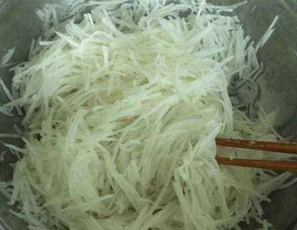 第二步:将萝卜用清水洗净,切成薄片再切成细丝,放入碗中,撒上适量的盐拌匀。