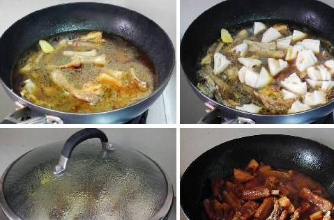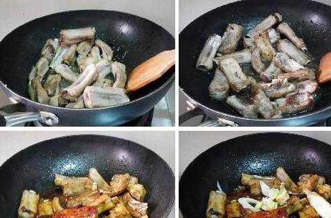 9炒至排骨上色后烹入料酒加入红烧酱油。
