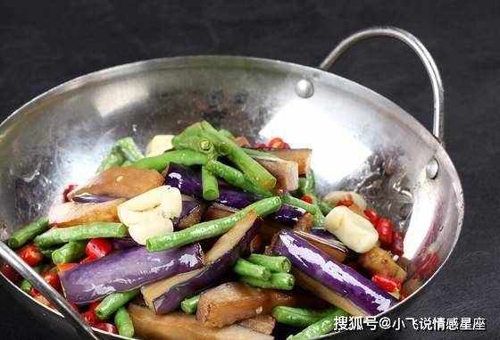 在另一个锅中加热油。油热后加入蒜末、姜丝、干辣椒和葱花爆香。然后倒入炸好的茄子和豆子炒至光滑。