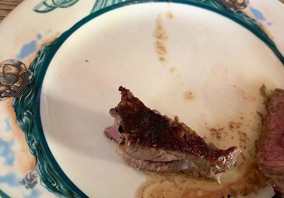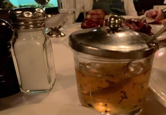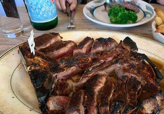 餐前面包的品种丰富,味道很好!配上店里自制牛排酱,让你的胃充分打开欲望,准备迎接主角的上场。这家店的服务员永远是岁数大的大叔,白衬衫和黑领结的搭配,推着小车上菜,仪式感很全。他会把一个小盘子倒扣着,装牛排的厚盘子被小盘子支着。据说牛排的最后烹制规程是在这个脏不拉几的盘子里完成的。大叔的手特别快,告诉你别碰盘子,不然会烫掉一块皮!