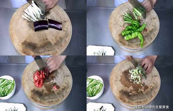 2、首先我们将茄子切成三段然后再改到切成条,辣椒切成条(稍微宽一点),大葱切成葱花,大蒜切成片分别放入盘中备用。
