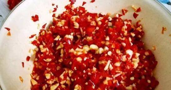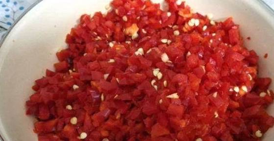 1、把小米辣用水洗干净后,自然晾干,之后用刀剁碎,特别注意:刀和砧板必须用开水烫一下,而且食材和所用的工具不能沾上生水,不然剁椒易变质
