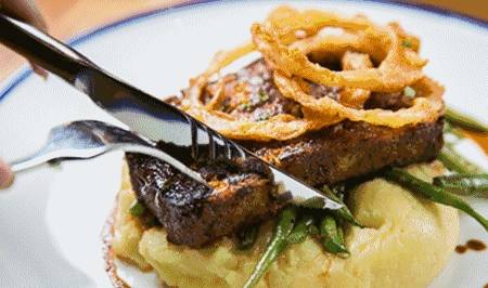 自制肉卷,上面是肉泥做的肉饼,下面是奶油土豆泥,最上面还有油炸的洋葱圈,一刀下去连着肉和土豆泥一起送进口中,口感丰富,一种奇妙的美味组合。