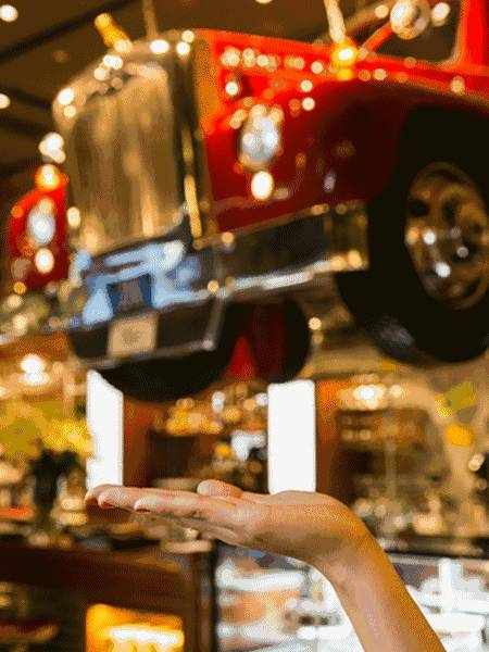 一家正宗的美式公路餐厅,刚一进门就被这个车头给吓到……一个完整的卡车头镶嵌在天花板上!足足有2米4!店里满满都充斥着美式的元素!例如铁艺,红皮椅子,木质,裸露灯泡等等……