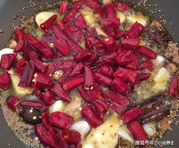 第六步:在另一个锅中加热油。油烧开后,加入姜片、蒜片、干辣椒、八角、花椒和桂皮炒香。