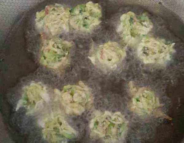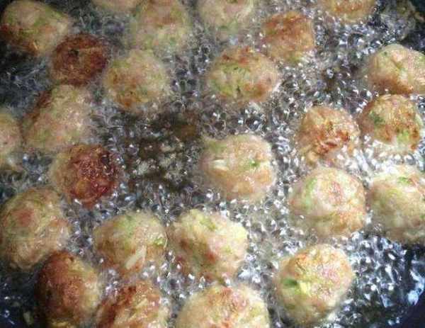第六步:锅中再倒入少许食用油,烧热,放入丸子用小火慢炖至丸子呈金黄色,取出查油即可食用。
