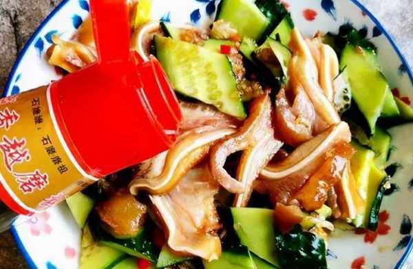 4、将黄瓜、猪耳朵、大蒜、小米椒放入干净的大碗中,加入适量的醋、生抽、盐、香油,拌匀即可食用。
