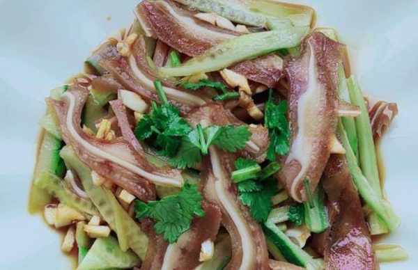 1.买一块腌猪草。有条件的话可以买新鲜的猪耳朵自己腌制。自然冷却后,放在砧板上,切成条状。