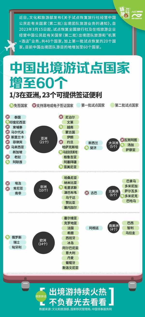 近日,文化和旅游部发布《关于试点恢复旅行社经营中国公民赴有关国家(第二批)出境团队旅游业务的通知》,自2023年3月15日起,试点恢复全国旅行社及在线旅游企业经营中国公民赴有关国家(第二批)出境团队旅游和“机票+酒店”业务,共40个国家,加上第一批试点恢复的20个国家,目前中国出境团队游目的地增加至60个国家。