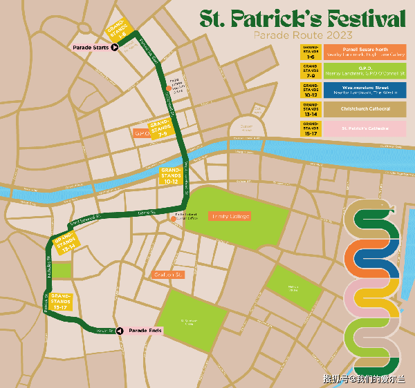 预计今年的游行路线将有50万名观众,其中包括7个创意表演,10个过渡性表演,来自爱尔兰、北美和加拿大的15个进行曲乐队,以及4,000多名参与者,这将成为有史以来规模最大的圣帕特里克节游行。