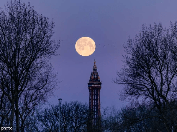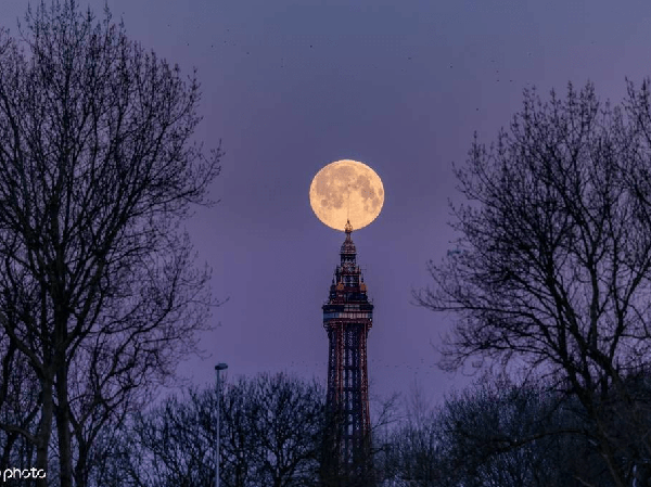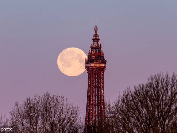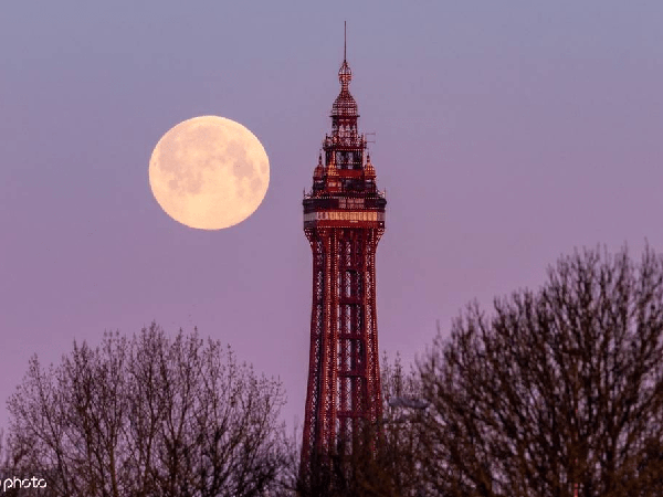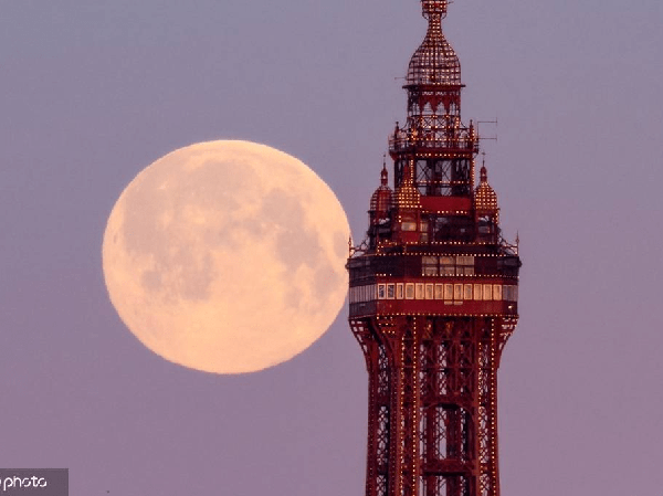 英国布莱克浦蠕虫月高挂天空,与塔楼相伴格外浪漫。