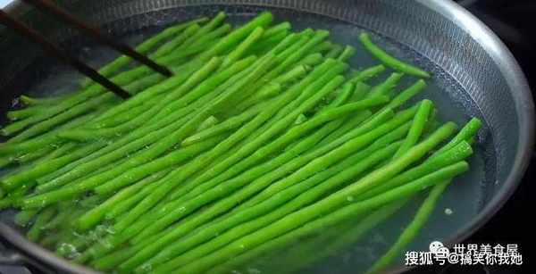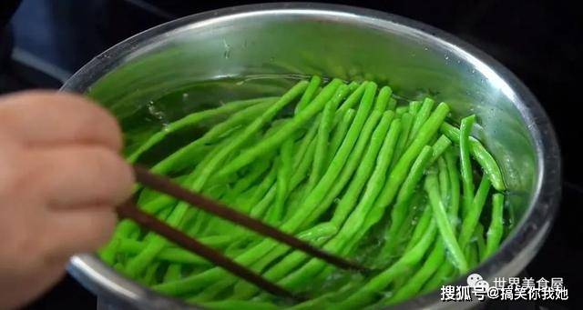 3、豆角变脆绿色后,将它捞起来,再过一次凉水,豆角变得更脆嫩好吃。