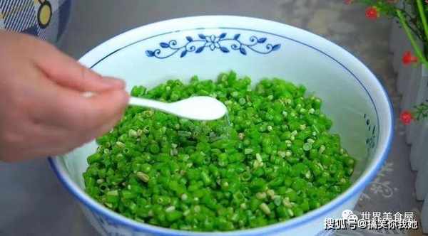 5、切碎的豆角放碗中,加一勺食盐调味,同时可以保持豆角的翠绿色不变。