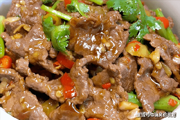 起锅烧油,油热放入泡椒、蒜末和小米椒,爆出香味以后,接着倒入牛肉翻炒,加一勺米酒去腥,
