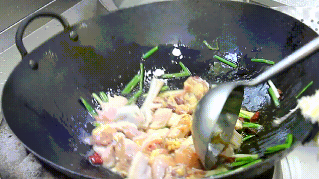 炒香以后放入蚝油4克,可以增加鸡块的鲜味,然后倒入鸡块继续翻炒,把鸡块的色泽翻炒均匀。