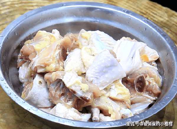 其余部分剁成小块放入盆中,鸡块尽量的切匀一点,切好以后用清水清洗干净。