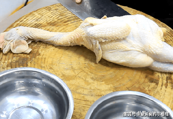 把三黄鸡从中间平切成两部分,切掉三黄鸡的尾部和脚趾尖。
