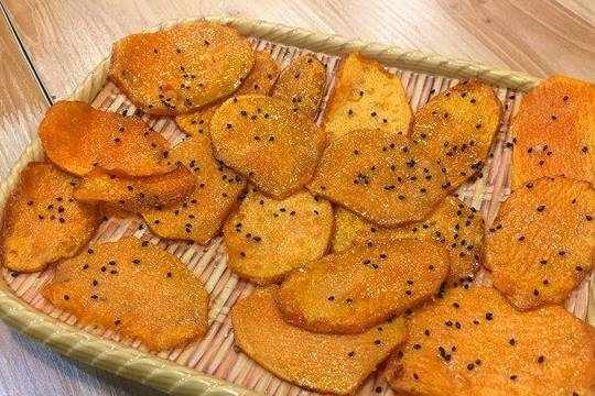 地瓜片上桌时是温的,一盘量还挺足。表面好像刷了蜂蜜水,搭配黑芝麻,香香甜甜糯糯,不腻人。