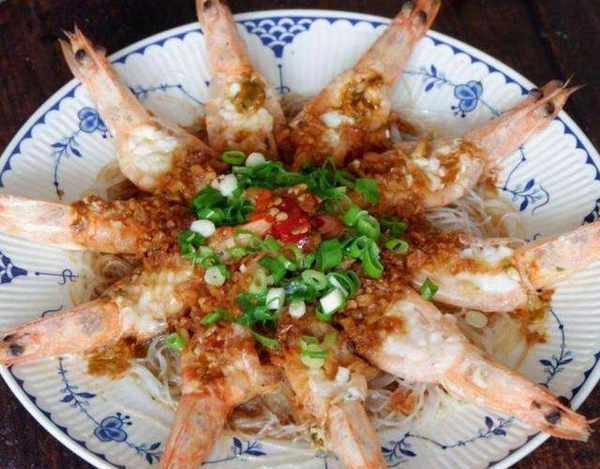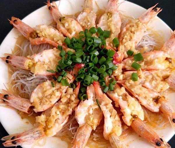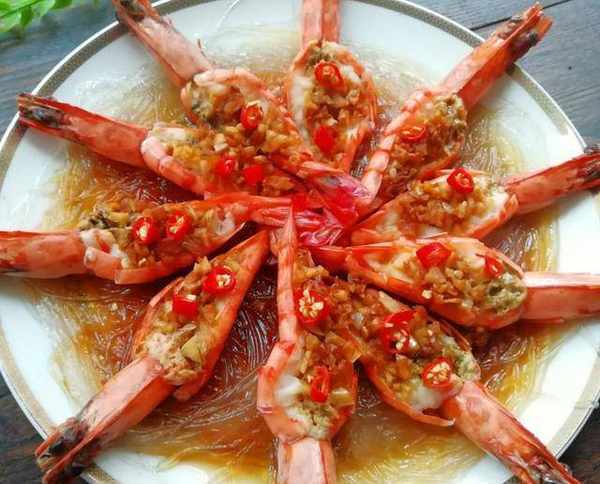 第五步:准备一个干净的蒸盘,先铺上粉丝,然后把虾放在上面,最后把炸好的蒜蓉淋在虾上。