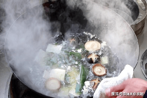 开大火把水烧开,倒入香菇、海带结和切好的豆腐,继续保持开大火煮出豆腐中的杂质、去除豆腥味,用勺子打去浮沫。