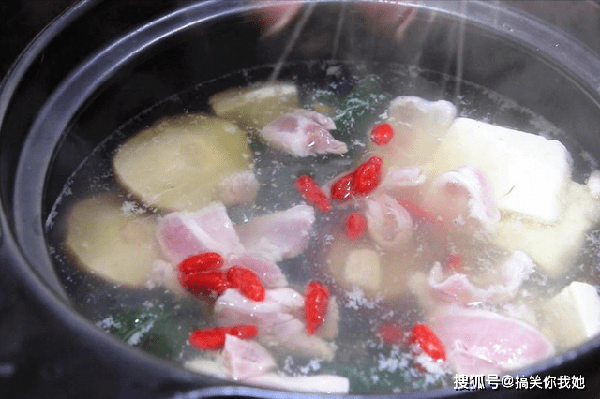 ,盖上锅盖开小火慢炖15分钟,把原料炖熟、让食材的营养融入到汤里面。15分钟以后放入切好的肉片和泡发的枸杞,