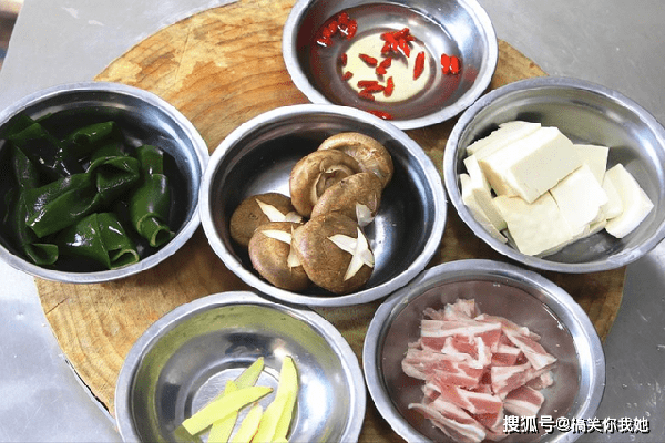 准备几朵香菇,洗干净以后把根切掉,在表面切上十字花刀;嫩豆腐一块,切成均匀厚片;适量的海带结,放入碗中备用。