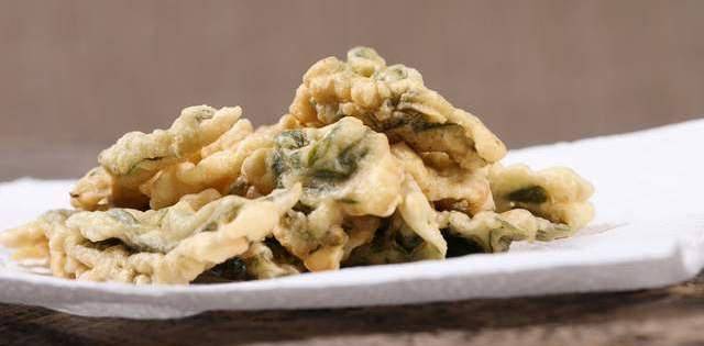 第五步:锅里再倒入少许食用油,大火烧热,转中小火,放入包好的香椿炸至金黄色,捞出放油。在盘子上食用。