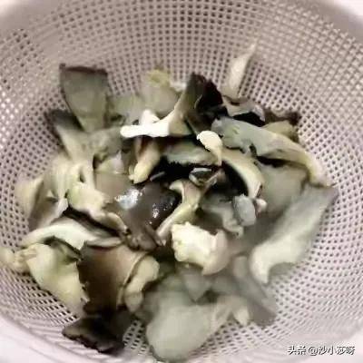 5.把凉水的蘑菇捞出来放进筐里控水,可以用水轻轻的赶出来蘑菇里的水,不要太用力以防蘑菇破碎。
