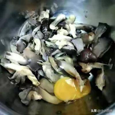 7.有条件的可以当个鸡蛋让其更加香脆,然后打碎使鸡蛋的液体黏在蘑菇表层,也可以不放鸡蛋。