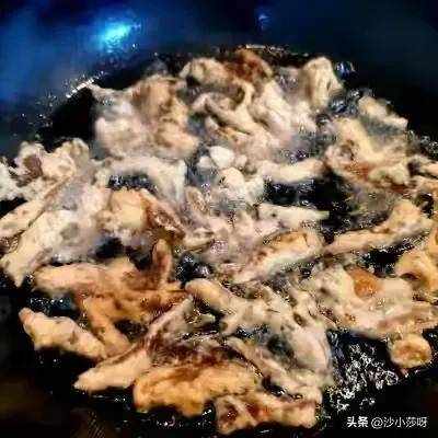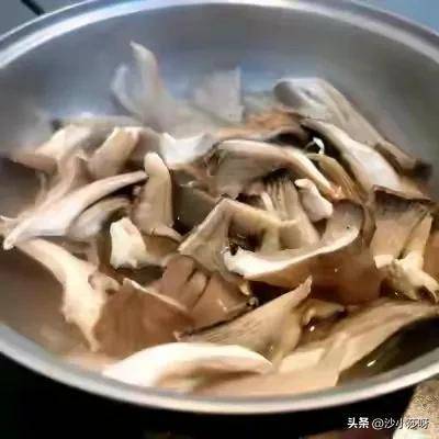 11.油加热到6成热的时候开始放蘑菇,放的时候手尽量的低一些,越高的话油越容易溅出来,尽可能的快速低距离的放。(注意防止烫伤)