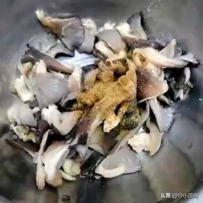 6.把控过水的蘑菇放进盆里,撒上底料盐,十三香,鸡精,味精,少量孜然粉。然后抓拌均匀。