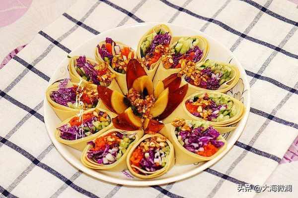 年夜饭的餐桌上白菜和豆腐不能少,白菜谐音”百财”,有聚财、招财、发财、百财聚来的寓意。豆腐代表着福气和福运,寓意福星高照福气满满。这道菜主料是紫白菜和干豆腐,搭配胡萝卜、黄瓜切丝,用干豆腐卷起来切段摆盘,松花蛋切花摆在上边,大蒜、醋、白糖、生抽调个料汁浇上就OK了。