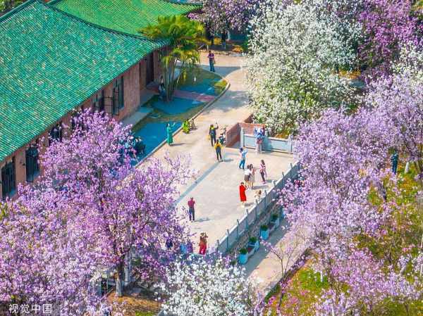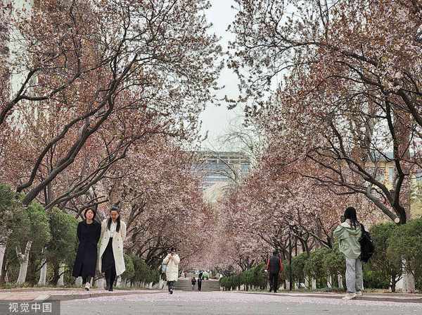 2023年3月16日,济南,山东师范大学千佛山校区百余株紫叶李花迎春怒放,落英缤纷,学生漫步“繁花大道”,宛若画中游。 中新社记者 赵晓 摄