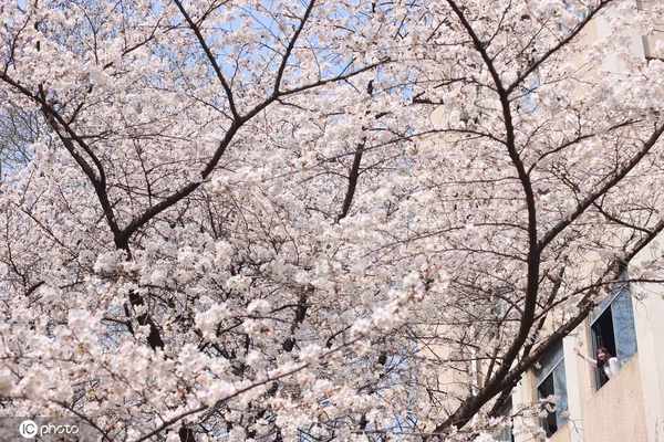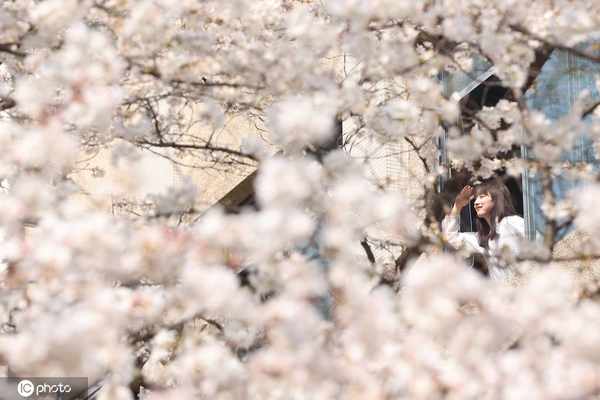 2023年3月15日,江苏南京,东南大学建筑学院的学生欣赏窗外的樱花。 中新社记者 泱波 摄