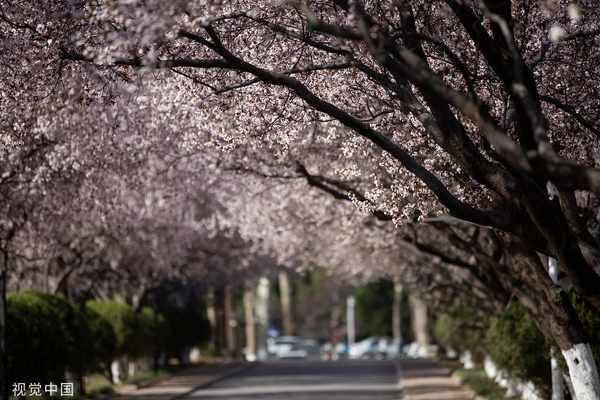 2023年3月13日,济南,山东师范大学校园内,春季紫叶李大道两侧花朵盛开,远远看上去一片粉色,将校园装饰一番,分外美丽!