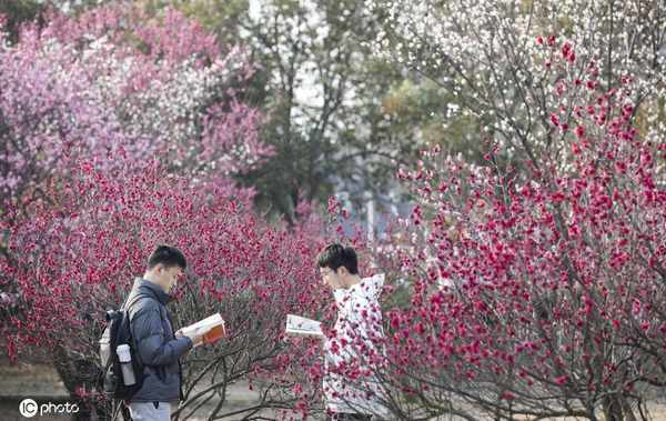2023年3月4日,江苏淮安,淮阴师范学院大学生在校园梅花林内读书。