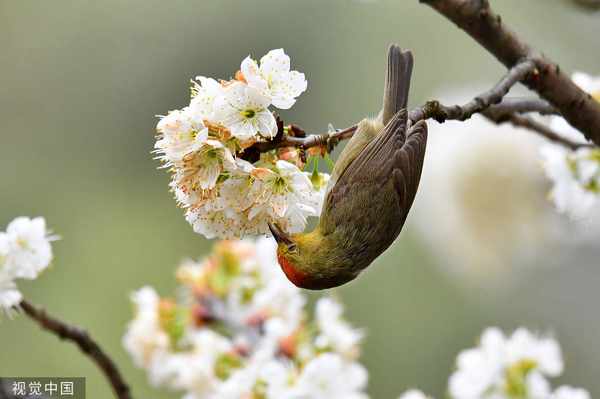 2023年3月10日,贵阳,贵州省财经大学校园里的樱桃花竞相绽放,各种鸟儿在花丛间驻足、觅食、嬉戏,春意盎然。